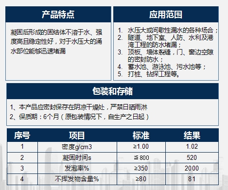 由多異氰酸酯和聚醚多元醇等 原料制成的一種高膨脹型建筑防水補強材料。該產品與水作用后能在數分鐘內體積膨脹至幾十倍,凝固后形成的固結體不溶水、 強度高且穩定好,對于水壓大的涌水部位能夠迅速堵漏,長久防水。該產品自身也能吸收空氣中的微量水分子發生同等化學反 應,對于較干燥的縫隙也能起到很好的填充密封作用,達到有效 和完美的防水效果。