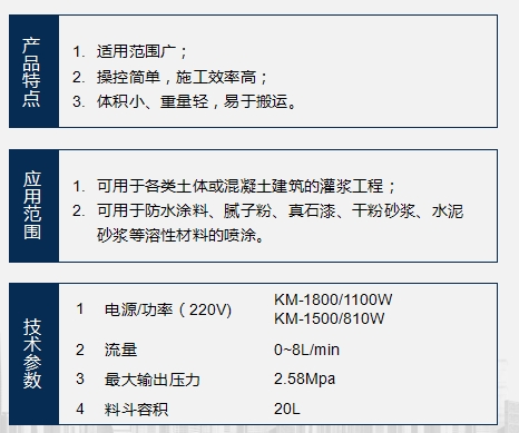 KM-1500是使用國外先進的螺旋泵送技術,并結合國內實際施工需求而開發出的一種新型灌漿與噴涂兩用機械。